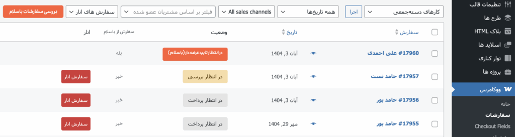 در صورتی که از پلاگین باسلام استفاده کنید بطور خودکار این سفارش ها به عنوان سفارش انار شناخته نمی شوند و همانطور که میبینید لیبل سفارش انار برای آنها ثبت نمی شود.